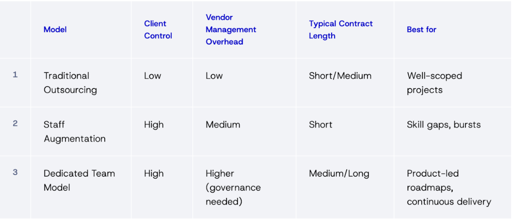 In short: the dedicated team model shifts from “vendor delivers outcome” to “team works as extension of client’s team”.